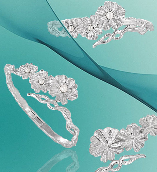 Floral Elegance: Beautiful 925 Sterling Silver Bangle with Shell Pearls